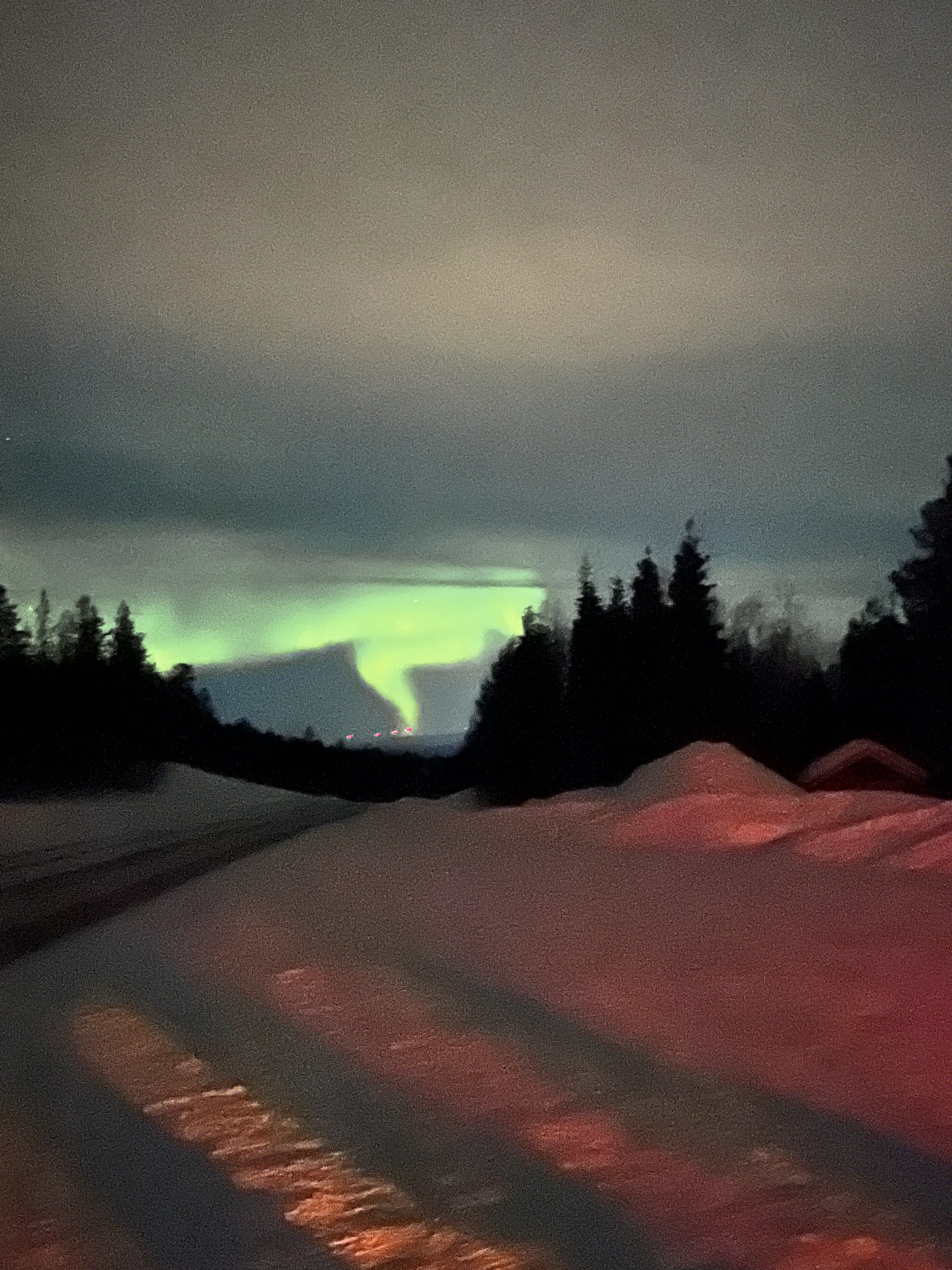 Die Polarlichter zu sehen, war tatsächlich der Hautgrund weshalb wir uns für den Trip nach Lappland entschieden haben. Wir haben bereits Wochen vor unserem Reiseantritt eine Nordlichter-Tour in Levi gebucht. Wir haben uns für eine Schneemobiltour entschieden, welche ca. 3 Stunden (20–23 Uhr) gedauert hat. Zu Beginn der Tour wurden allen Teilnehmern warme Handschuhe, Stiefel und ein Polaranzug kostenlos zur Verfügung gestellt, damit niemand frieren muss. Die Tour war super cool und bekommt von uns eine ganz klare Empfehlung! Wann hat man schon mal die Möglichkeit mit einem eigenen Schneemobil durch die Wälder Finnlands zu fahren und Nordlichter zu „jagen“?! Mein Mann und ich haben uns ein Schneemobil geteilt. Unsere Gruppe bestand aus ca. 15 Leuten. Gemeinsam sind wir dann nachts durch die Wälder gefahren. Einen Zwischenstopp gab es auch, in einer kleinen Hütte im Wald hat unser Tourguide ein Feuer zum Aufwärmen vorbereitet. Dazu gab es gegrillte Würstchen am Spieß (auch vegetarische Würstchen wurden angeboten) und heißen Beerensaft. Leider hatten wir in dieser Nacht kein Glück mit den Nordlichtern. Es war zu stark bewölkt, aber dennoch war die Tour jeden Cent wert!